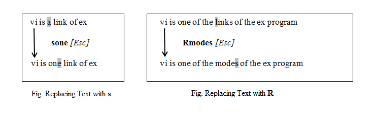 A replacing Text: To replace a single character with another, you can use r . For replacing one character with another character press s. R for replaces all text on the right side of the cursor. S replaces the entire line irrespective of cursor position.