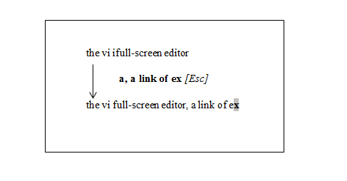 Insertion of text: for insert into input mode we can use (i and a) command. This commands changes mode from command to input. If you invoked this command on existing the cursor will shift into right side of text.If we use a for append the text will also shift to right side.